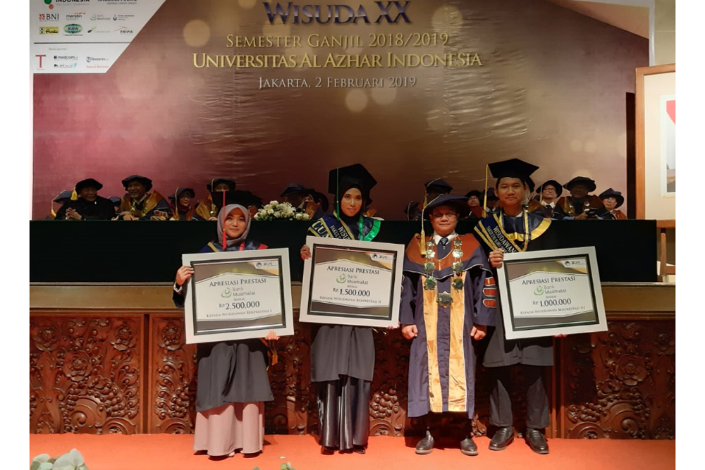 Di wisuda ke-20 ini, mahasiswi Fakultas Hukum, Program Studi Hukum Angkatan 2014, Nuraemy Firdaus, terpilih sebagai wisudawan terbaik se-Universitas. Ia memperoleh IPK 3,87 sehingga lulus dengan predikat cumlaude. Semasa kuliah, Nuraemy aktif mengikuti berbagai organisasi dan paper competition antara lain sebagai Vice President of Al Azhar Youth Leader Institute yang merupakan organisasi kepemudaan di bawah bimbingan Masjid Agung Al Azhar. Nuraemy juga mendapatkan Best Paper of Social Project’s Paper Presentation, AFSEC – International Student Leaders Exchange Bangkok, Thailand. Serta Publishing International Journal, Glogal Research Development Service di Nanyang Technological University, Singapore.